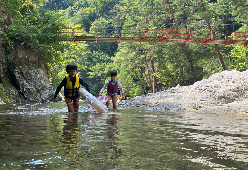 万古渓谷(まんごけいこく)は、天竜川の支流で金森山を水源とする万古川上流の渓谷。瀑布、淵、奇影が続き、千古の密林のおおいかぶさる秘境で、沢歩きの醍醐味を充分味わうことができます。泰阜村二軒屋では、美しい水が流れ沢遊びを楽しめます。