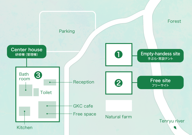 GKCは、①手ぶらキャンプサイト、②フリーサイト、③研修棟の3つのエリアで運営するとても小さなキャンプ場です。全エリア FREE Wi-Fi 完備。施設ご利用中に出るゴミの引取りOK。貸切風呂のご利用が可能です。