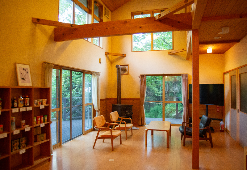 気の置けない仲間たちと...。なかよし友達家族と...。企業研修や勉強合宿などにも最適な大型業務用厨房完備です。みんなでワイワイ食事を作ったあとは、鳥の鳴き声を聞きながらアウトドアデッキで召し上がることができます。管理棟ご予約の場合、テントサイトはクローズしますので、周囲を気にすることなく楽しめます。子供さん大はしゃぎの2段ベッドは、大人も冒険心がくすぐられます。また、フリースペースには暖炉を完備。秋から冬の時期にも快適にお過ごしいただけます。